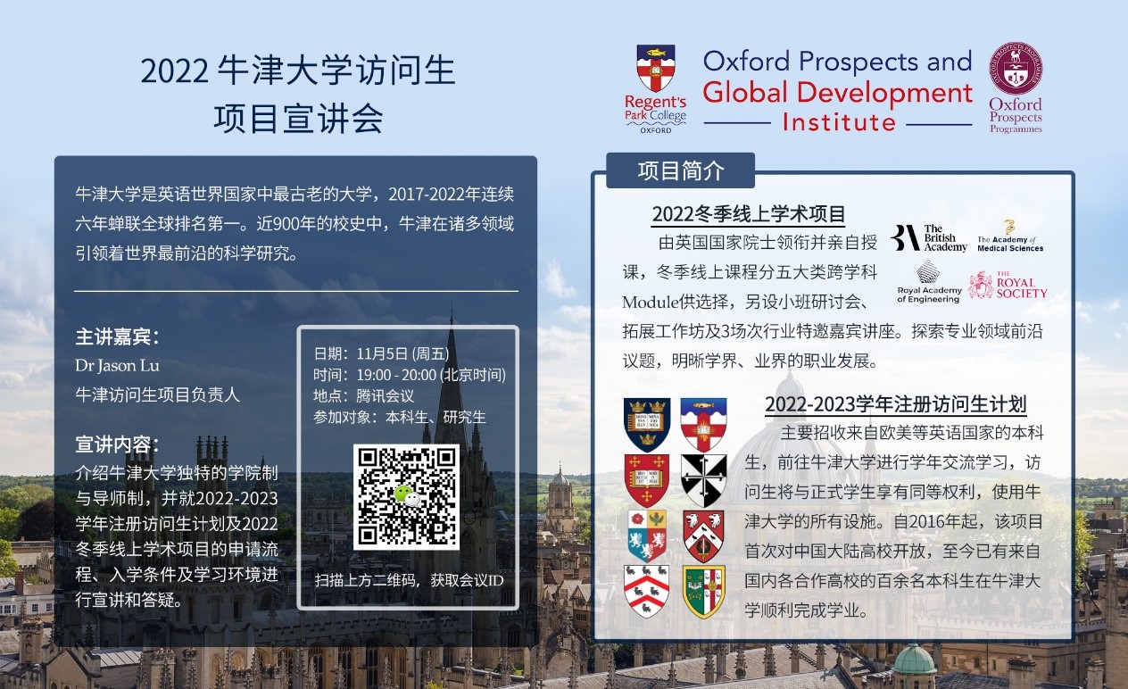 牛津展望计划办公室拟于2021年11月5日(周五)19:00举行线上项目宣讲会。届时,牛津项目负责人Dr. Jason Lu将介绍牛津大学独特的学院制与导师制,并就2022-2023学年注册访问生计划及2022冬季线上学术项目的申请流程、入学条件及学习环境进行宣讲和答疑。