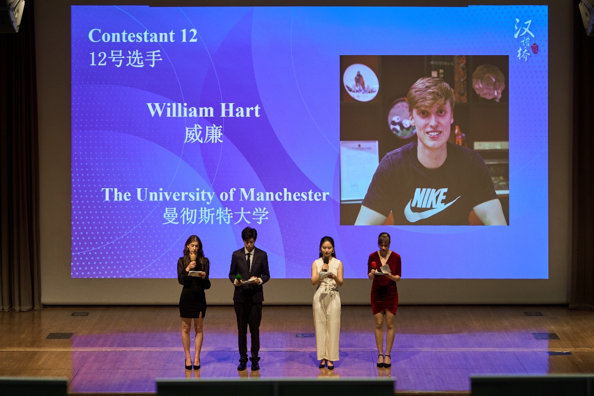 本次比赛由中国教育部中外语言交流合作中心主办,中国教育部中外语言交流合作中心英国代表处承办。比赛主题为“天下一家 (One World, One Family)”,比赛包括命题演讲、知识问答、才艺表演和即兴问答4个环节。我校合作共建的曼彻斯特大学孔子学院有两名选手进入决赛,其中William Hart(何威)凭借其精彩表现荣获特等奖,成为本届赛事的冠军,他将同其他三名获胜选手一起代表英国赛区参加全球总决赛;另一名曼彻斯特孔院选手Aude Rajaona(湖妮)获得优秀奖。
